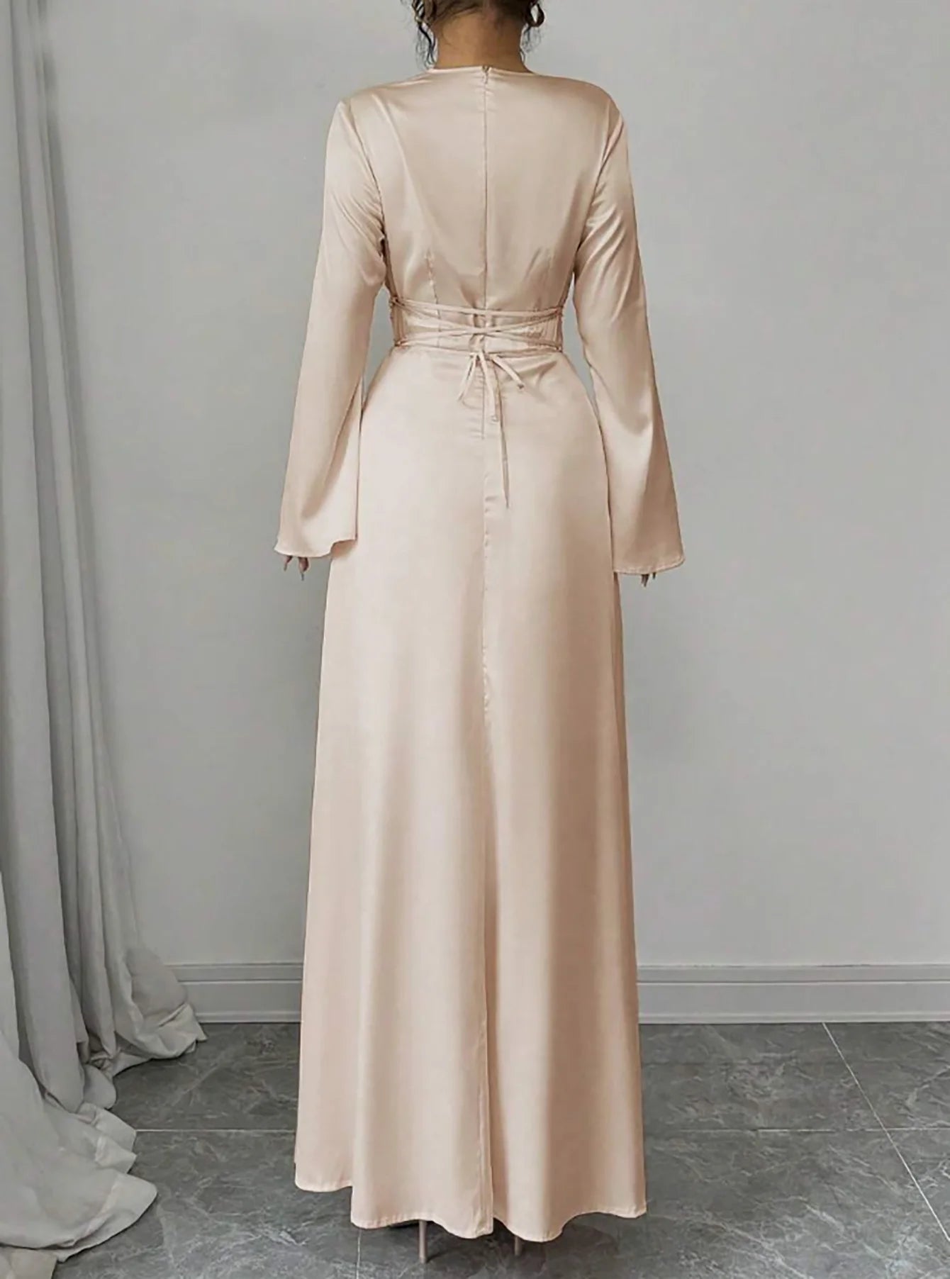 Maxi Dress Spring Summer Women Champagne Satin Cowl Neck Flared Sleeve Belted Elegant Luxurious Party Wedding Evening Dress