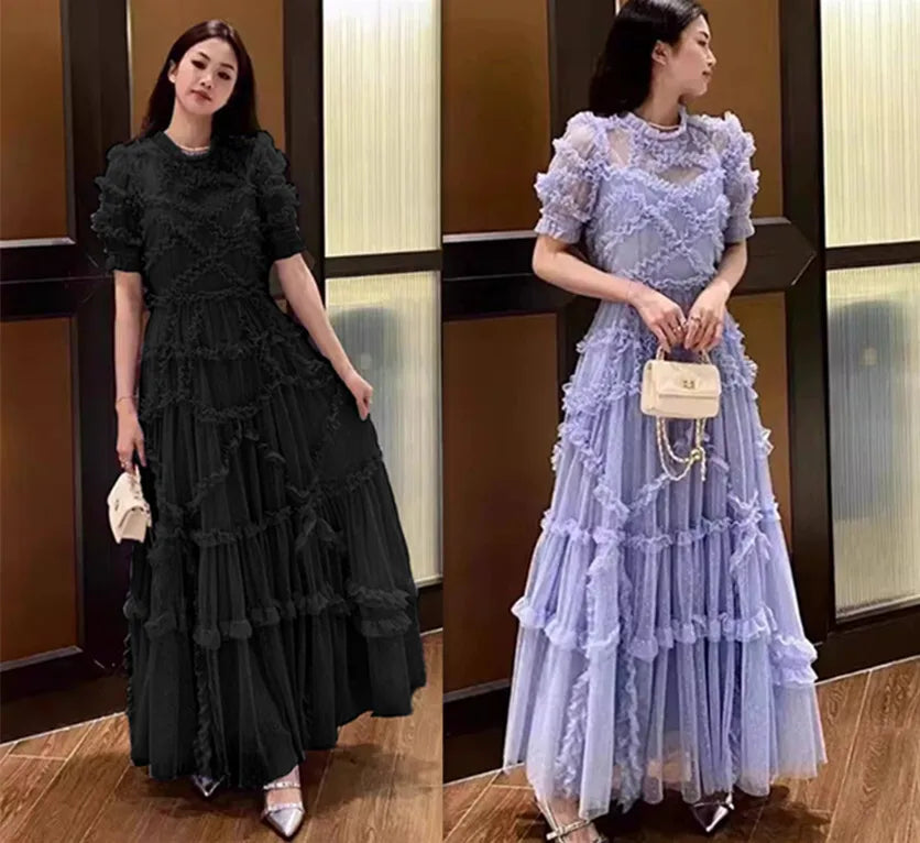 Quality Vintage Summer Holiday Layers Ruffle Cake tulle Long Dress Women Blue Dots Elegant Party Evening Vestidos