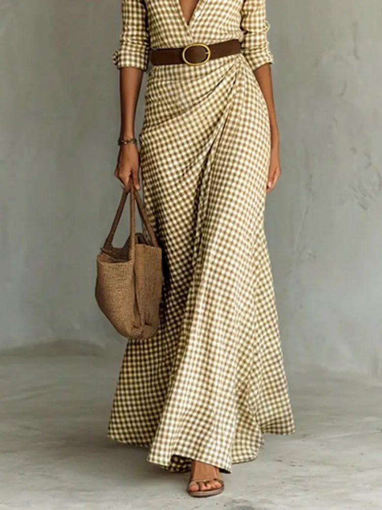 Yeezzi Women's Elegant Gingham Belted Lapel Shirt Dress Long Sleeves Buttoned Urban Casual Office Work Maxi Dresses 2026 New