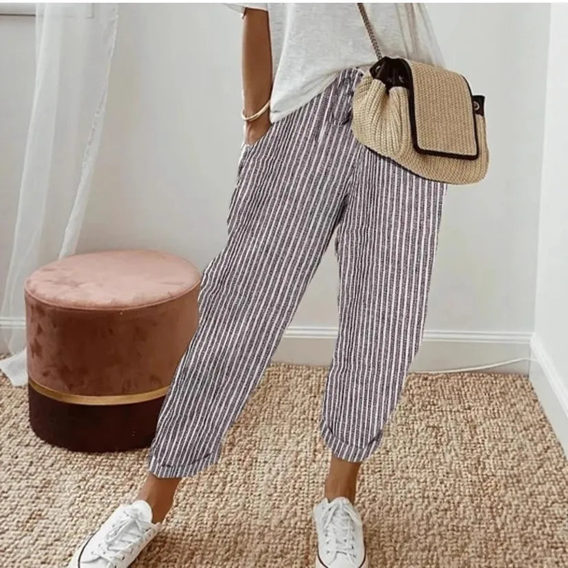 European and American Cross border Women's Summer New Fashionable Loose Stripe Printed Elastic Waist Drawstring Casual Pants