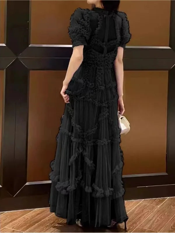 Quality Vintage Summer Holiday Layers Ruffle Cake tulle Long Dress Women Blue Dots Elegant Party Evening Vestidos